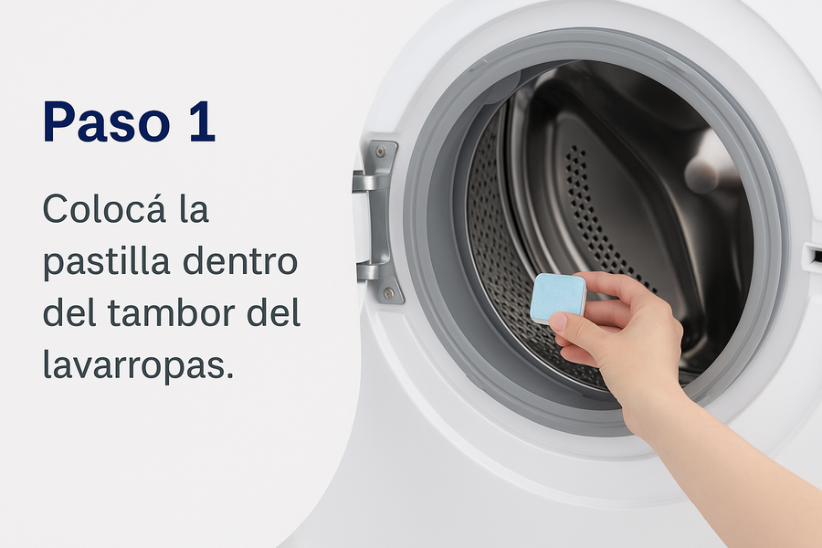 Colocá la pastilla dentro del tambor del lavarropas.