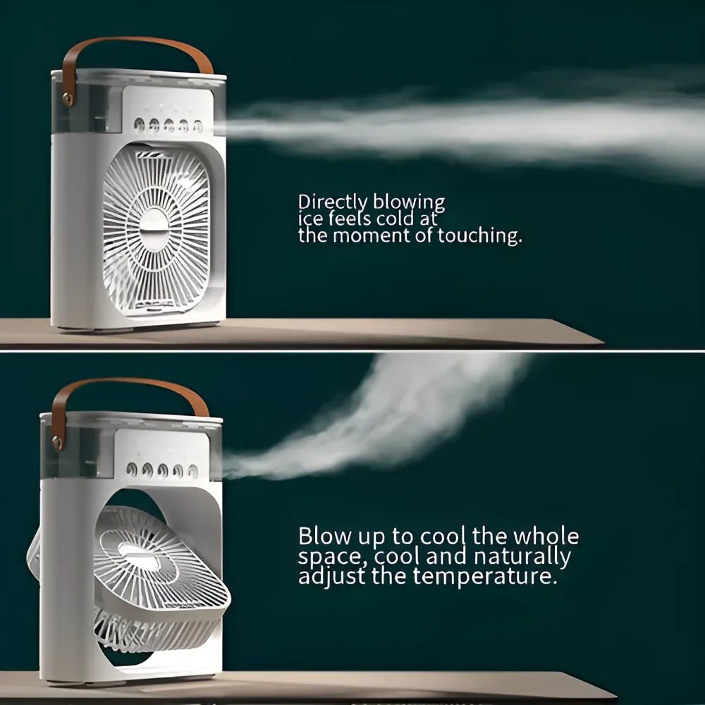 El Mini Ventilador Humidificador también incluye luces LED, añadiendo un toque de estilo y funcionalidad a su diseño. Su tamaño compacto y su peso ligero lo convierten en un compañero perfecto para cualquier actividad, ya sea en interiores o exteriores. Mantente fresco y cómodo en todo momento con este innovador ventilador que combina tecnología y diseño práctico.